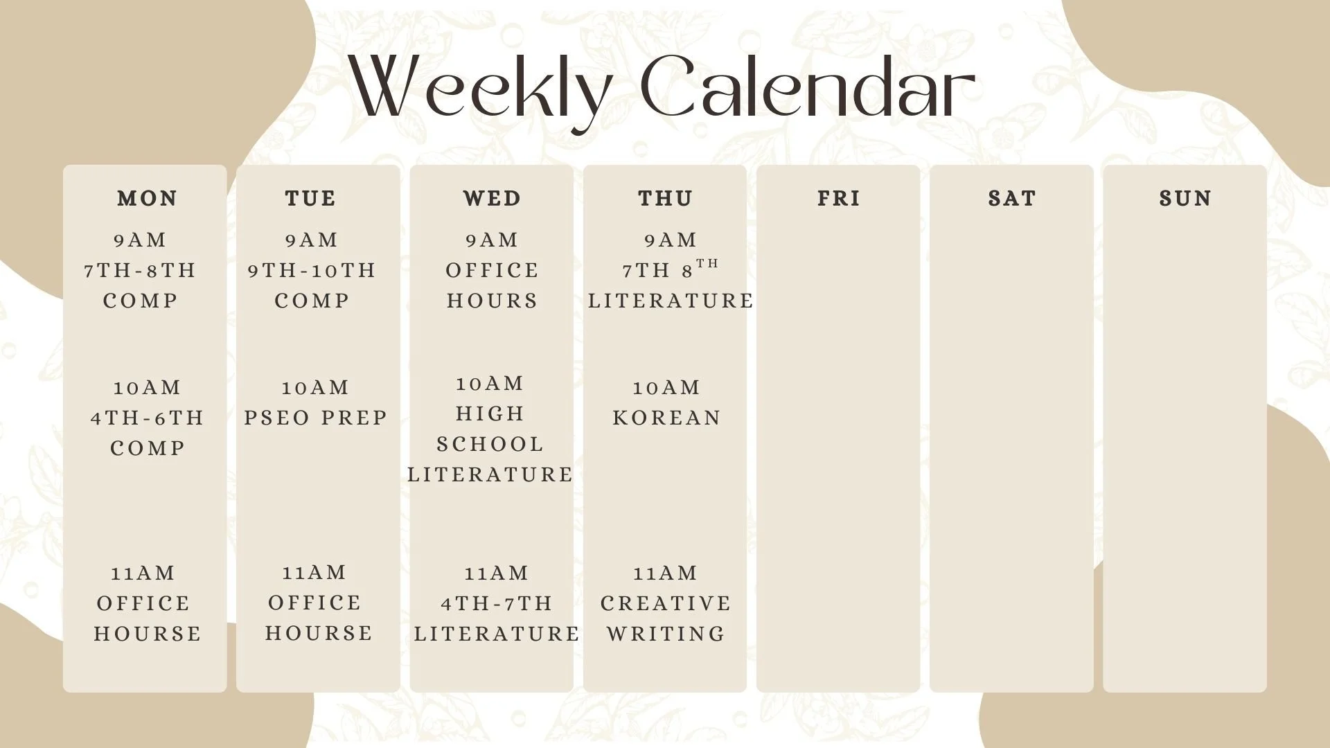 Begin the Adventure…Choose a Course Courses Categories: All Creative Writing Literature Course Composition Summer Classes Fall Courses Spring Courses Courses All | Creative Writing | Literature Course | Composition | Summer Classes | Fall Courses | Spring Courses | 4th-6th Grade Composition Fall 2026 Sale Price: $250.00 Original Price: $275.00 Sale 7th-8th Grade Composition Fall 2026 Sale Price: $255.00 Original Price: $280.00 Sale 9th-11th Grade Composition 2026 Sale Price: $260.00 Original Price: $290.00 Sale PSEO Prep 2026 Sale Price: $265.00 Original Price: $300.00 Sale Creative Writing 101 Sale Price: $255.00 Original Price: $265.00 Sale 4th-7th Grade Literature Fall 2026 Sale Price: $240.00 Original Price: $250.00 Sale 7th-8th Grade Literature Fall 2026 Sale Price: $250.00 Original Price: $260.00 Sale High School Literature Fall 2026 Sale Price: $250.00 Original Price: $260.00 Sale Classics Sale Price: $260.00 Original Price: $270.00 Sold Out Korean Language and Culture Sale Price: $260.00 Original Price: $270.00 Sale